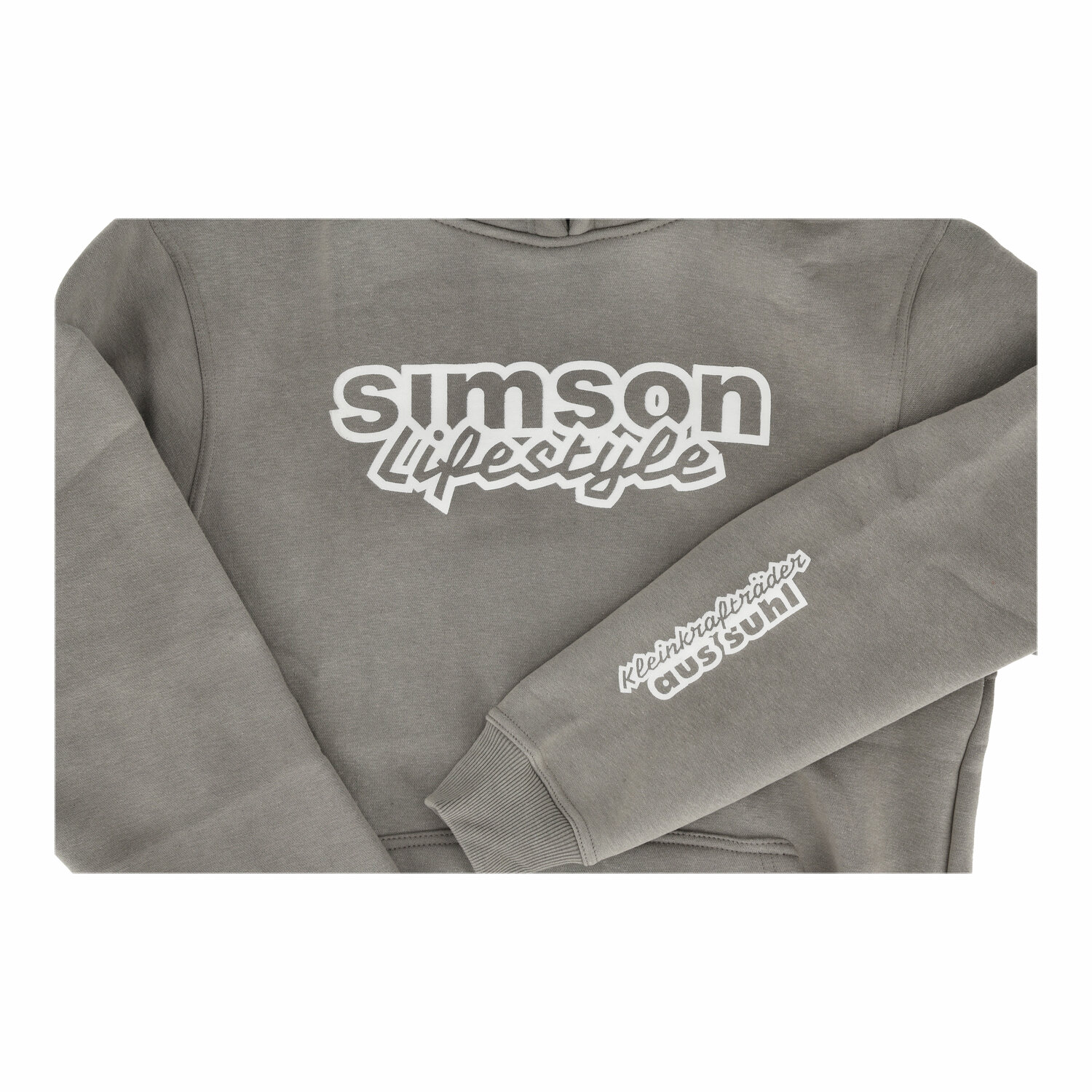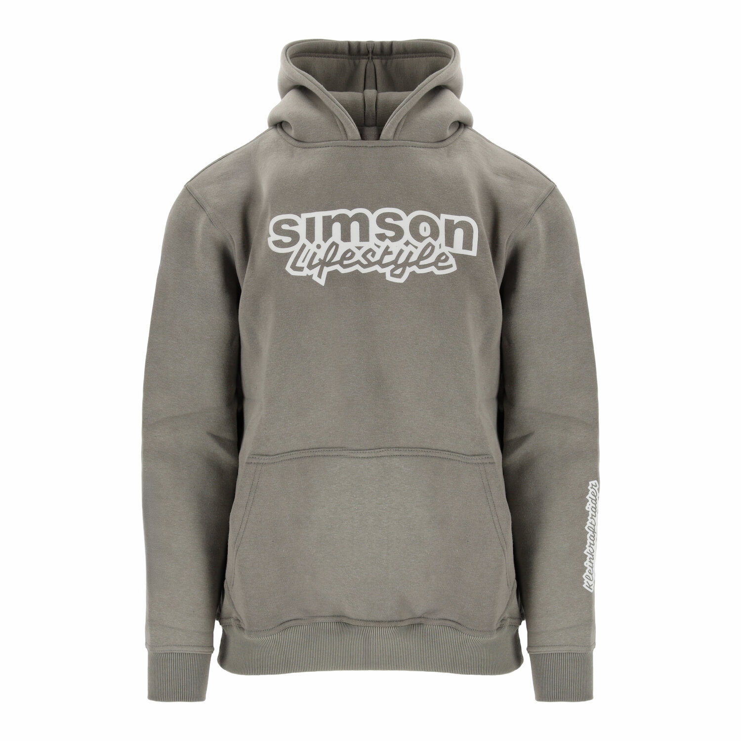 Die dezente Stonewash-Optik in Grau verleiht dem Hoodie einen urbanen, getragenen Look. Der weiße Brustprint „SIMSON Lifestyle“ setzt ein klares Statement, während der Schriftzug „Kleinkrafträder aus Suhl“ am Ärmel die Herkunft mit Stolz zeigt.